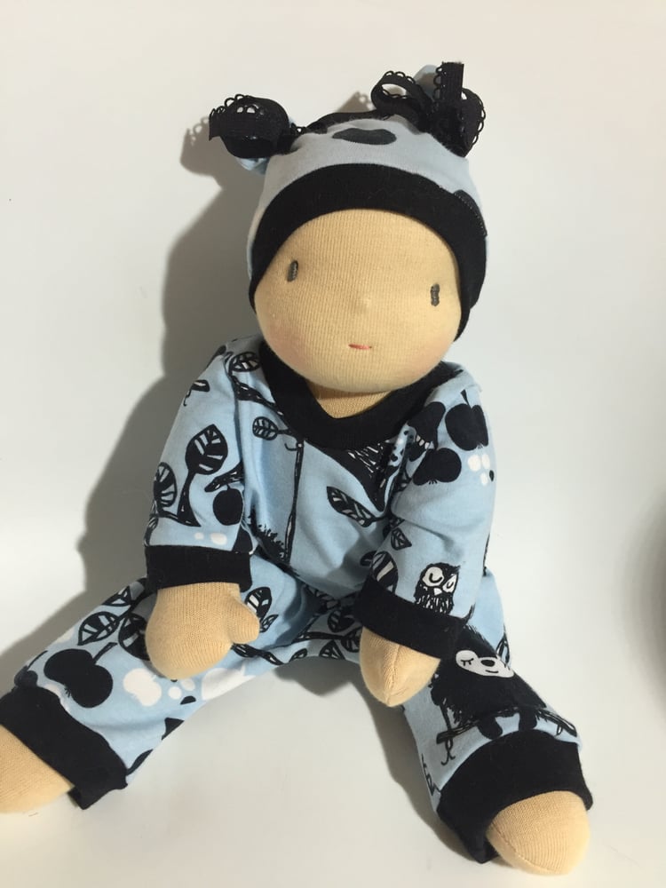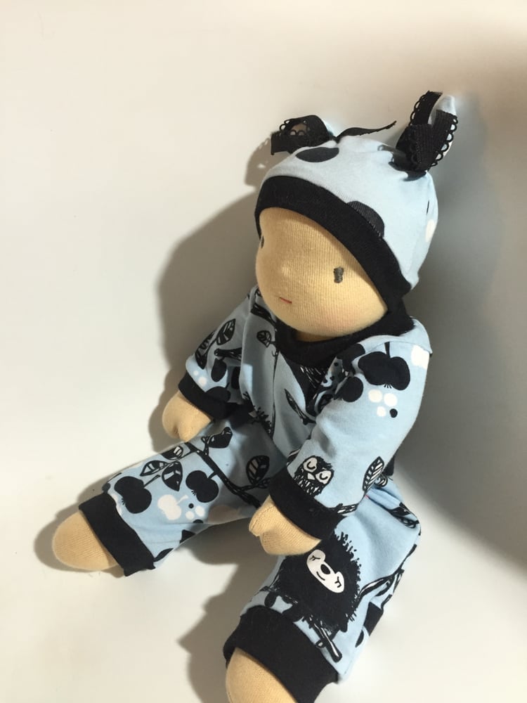 Son petit bonnet cousu à la tête ( ainsi que les liens ) et son pyjama en Jersey oeko tex